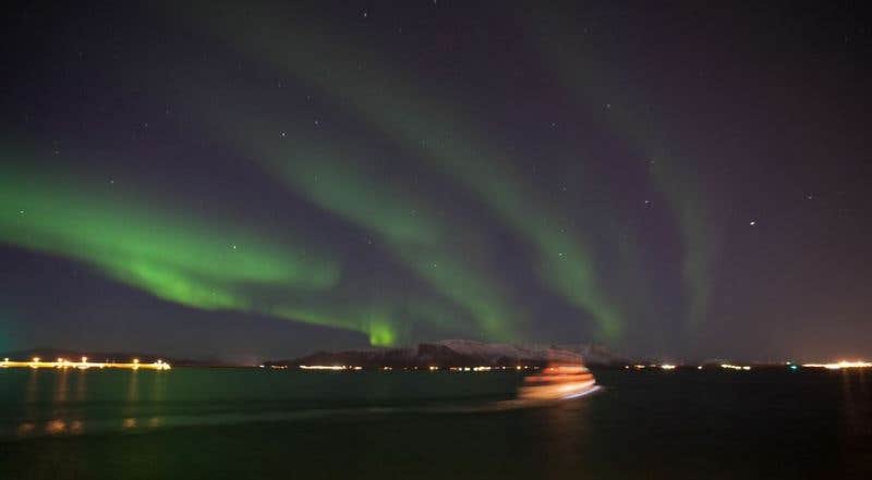 จากนั้นเตรียมตัวของคุณให้พร้อมเพื่อที่จะพบกับแสงเหนือที่งดงาม ขณะที่แสงเหนือกำลังเต้นรำอยู่เป็นแนวในสีสันที่ต่างกัน ตามลำดับสีเขียว และชมพูไปจนถึงสีม่วงและเหลือง คุณจะใช้เวลามากกว่า 1 ชั่วโมงบนเรือ แต่ไม่ต้องกังวลว่าจะหนาวเพราะเรือมีระเบียงด้านในพร้อมบาร์ที่คุณสามารถเข้ามาพักผ่อนได้ตลอดเวลา.