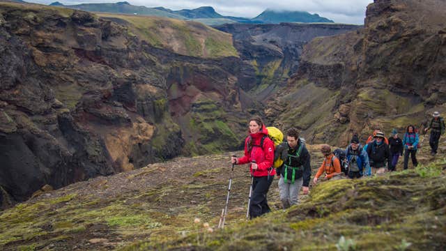 Day three's hike boasts diverse scenery. Marvel at volcanoes, black deserts, farmland, and a majestic canyon. Tonight you’ll stay at the Botnar hut.