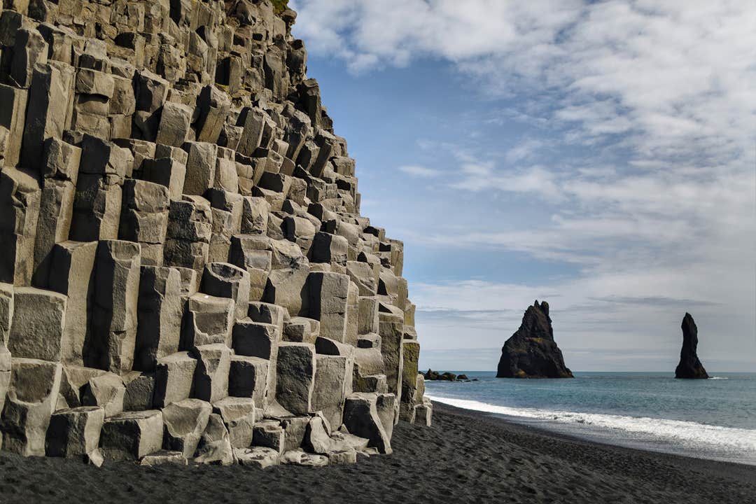 The next destination is the otherworldly black beach known as Reynisfjara where the waves of the Atlantic Ocean crash upon the black sands from which the seemingly man-made hexagonal basalt columns rise to cliffs filled with nesting sea birds.