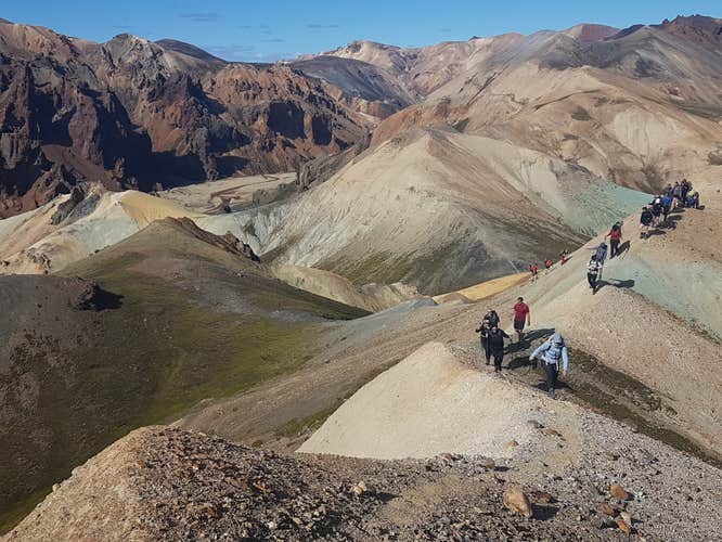 After an exciting drive, you’ll arrive in the Landmannalugar area, where the hike begins. This part of the Highlands is known for its rhyolite mountains. Here, you can see dramatic red, yellow, brown, pink, green, and blue colored peaks, a mesmerizing sight.