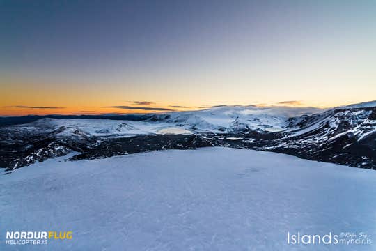 Soak in the sights of the ever so popular tour in style! Along our route you'll get the best possible view of the continental plates of Europe and North America drifting apart at the UNESCO world heritage site, Þingvellir National Park. We fly past desolate black sands, lunar landscapes, the volcano Skjaldbreidur, the geothermal wonders of Geysir, the spectacular waterfall of Gullfoss and Hengill geothermal area. Then we crown this exceptional Golden Circle trip with a landing on the second biggest glacier in Iceland, Langjökull glacier! You'll get a chance to walk on an ancient glacier, throw a snowball and get a photo of yourself on top of the world!