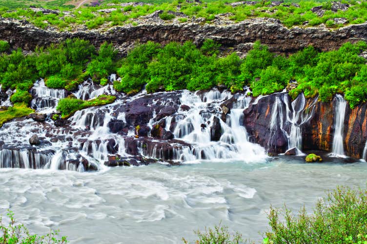 Next on the itinerary are the grand Hraunfossar and Barnafoss waterfalls. Hraunfossar, known as the "Lava Falls," features water flowing directly from a sprawling lava field. Countless streams cascading into the Hvita river create a mesmerizing visual treat.