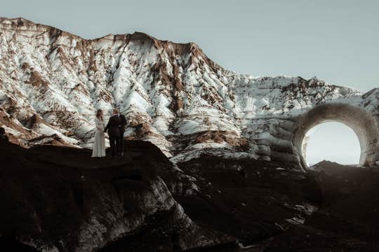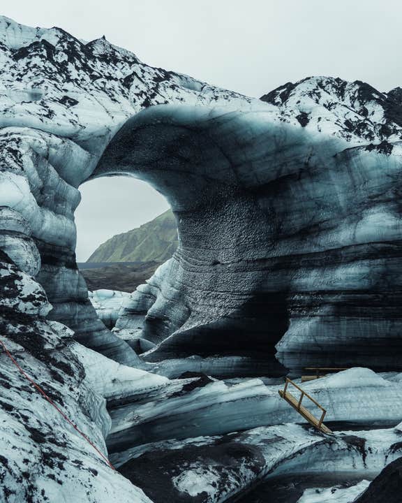 Katla ice cave, formed by centuries of volcanic and glacial activity, is a stunning natural wonder. It has walls of blue ice and streaks of black due to past volcanic eruptions by the volcano hidden beneath the glacier.